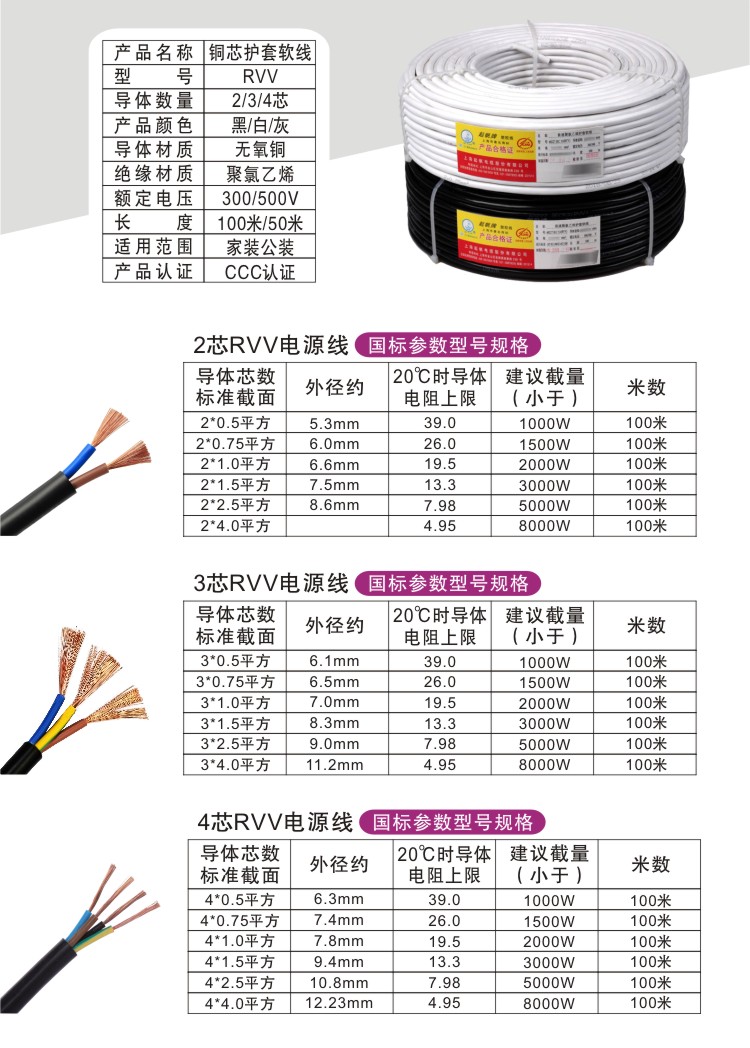 正泰 纯铜RVV电线 电源线 2芯2.5软白色护套线100米