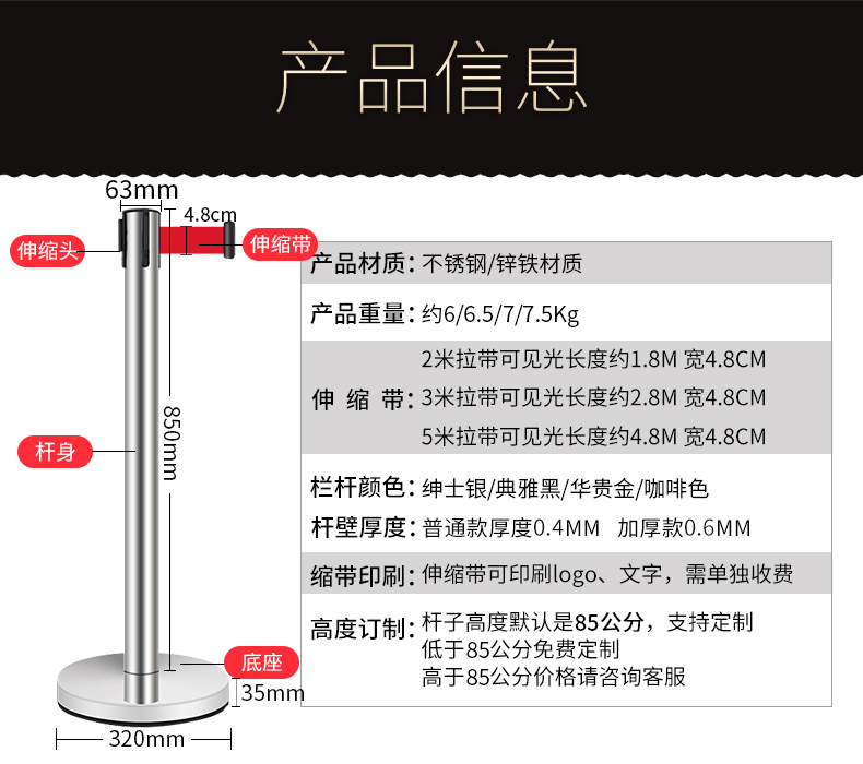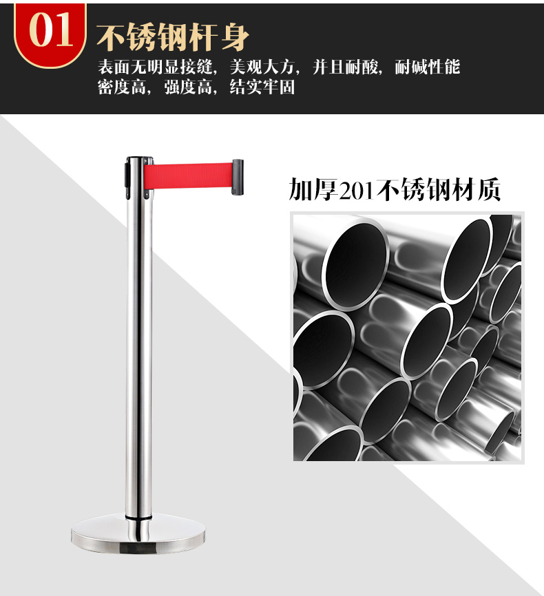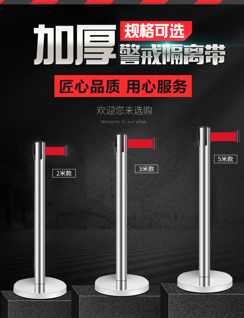 不锈钢一米线栏杆 警戒线隔离带伸缩带加厚栏杆座 排队护栏围栏杆 升级加厚加重2米线