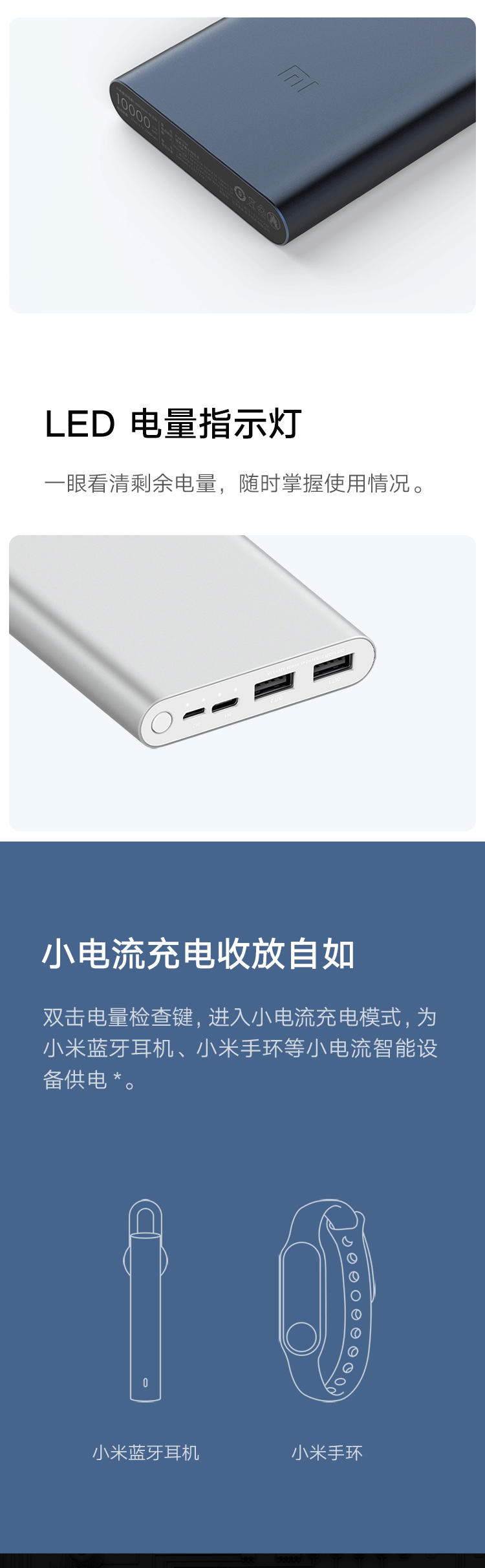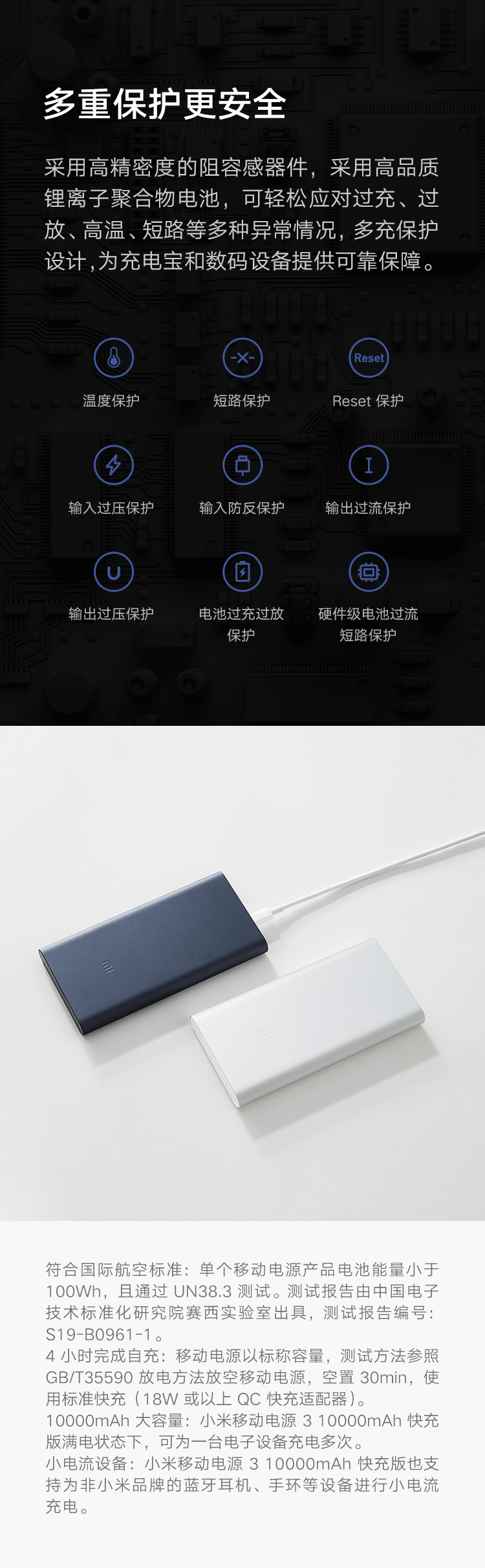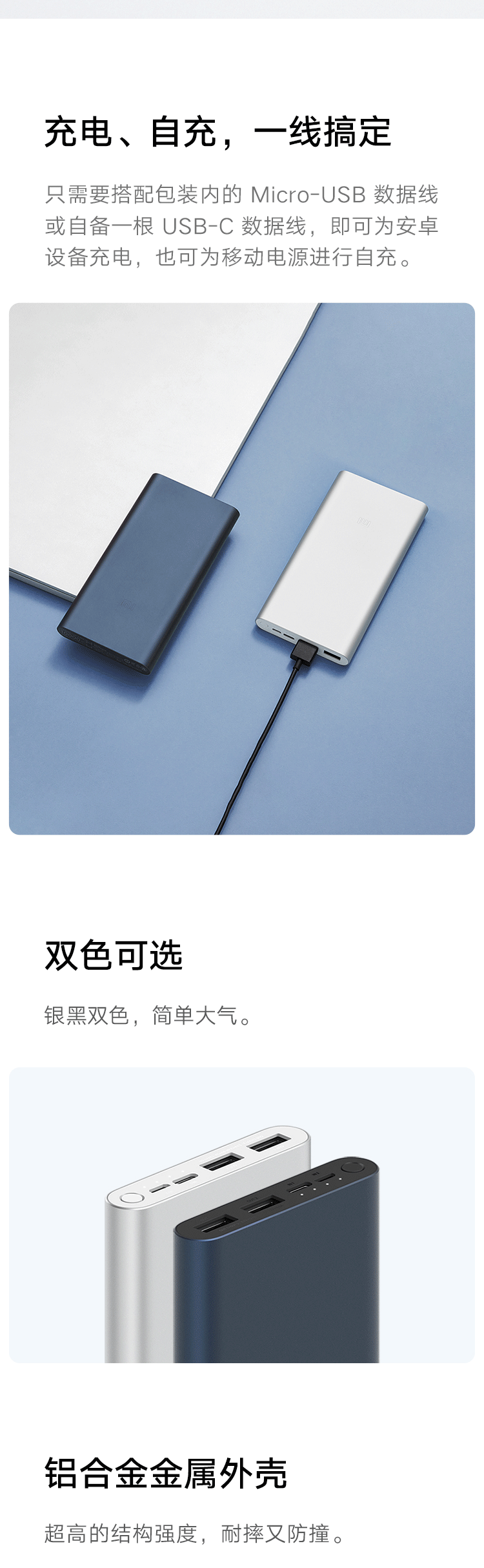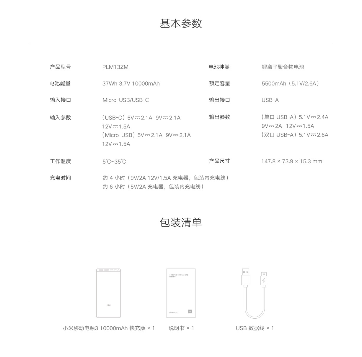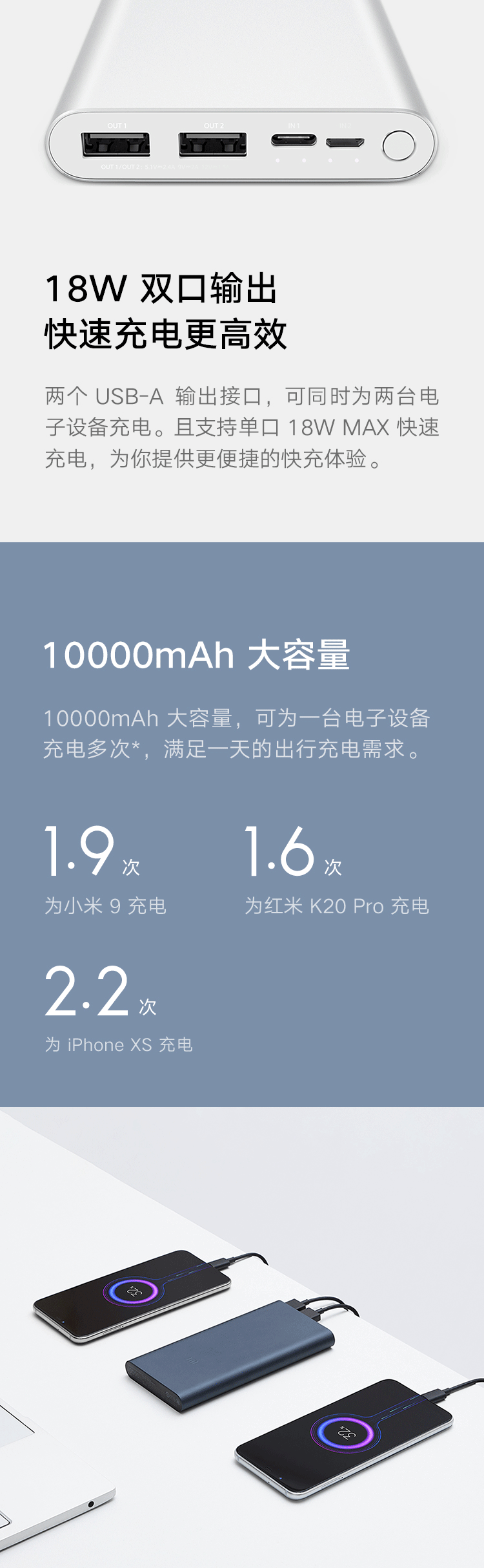 小米移动电源3 原装10000毫安时 18W快充版银色 内含数据线 适用红米9小米安卓redmi手机充电宝