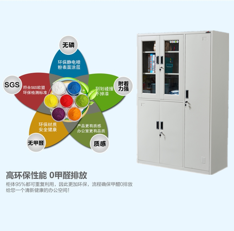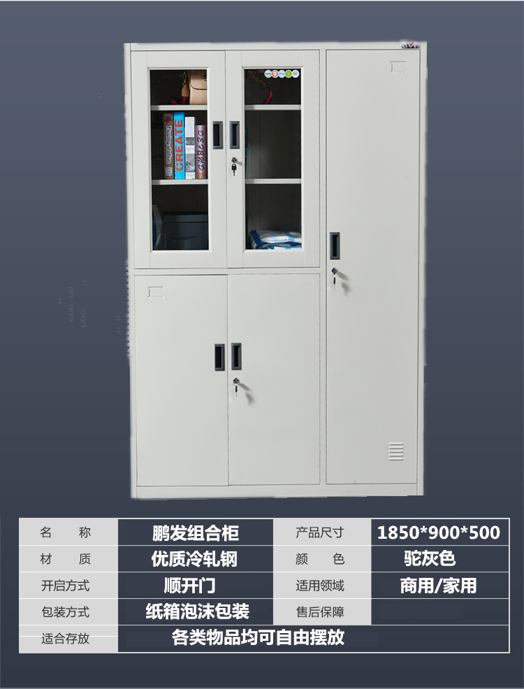 | 特性 | 优质冷轧钢板,经切割、焊接,酸洗磷化后喷涂环保环氧粉末。无甲醛安全放心。上门内二层隔板,下面一层隔板,玻璃门边采用压型边框,稳定性好,美观,右侧衣柜门上下各一块隔板,中间一个挂衣杆,颜色驼灰色。采用中国十大锁具品牌望通锁具。 |