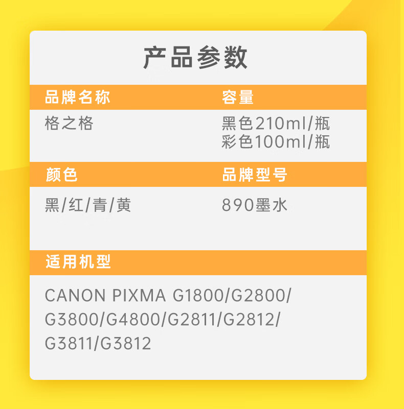 格之格 890墨水 黄色 适用 G2800 G1800 G2810 G2811 G2812 G3811 G1810