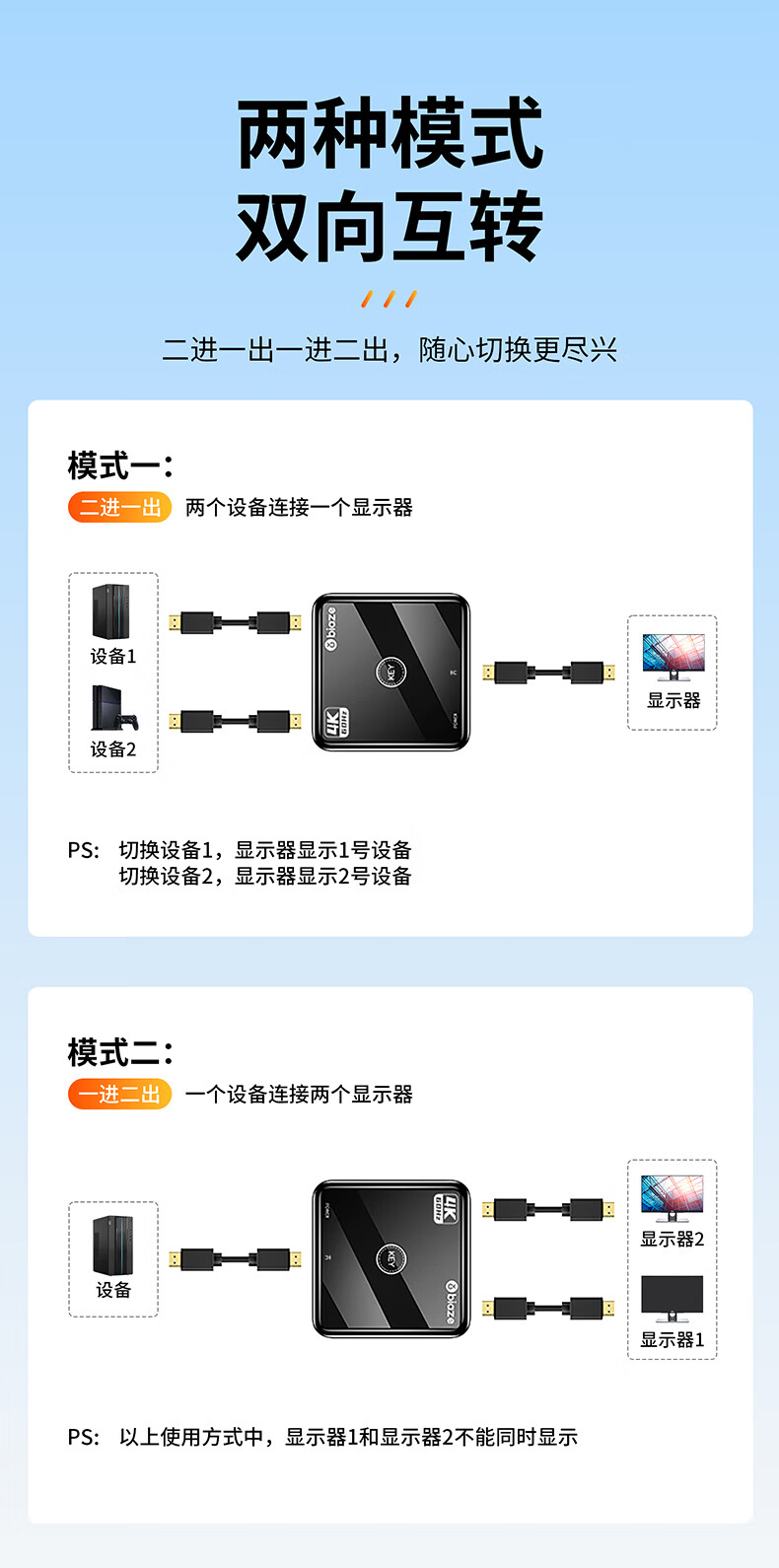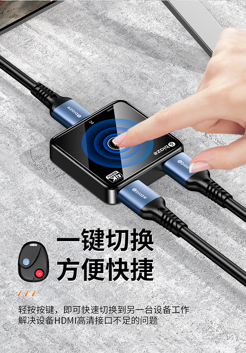 毕亚兹 HDMI2.0切换器 二进一出 带外置遥控器 4K60Hz视频双向分配器一分二